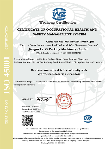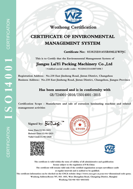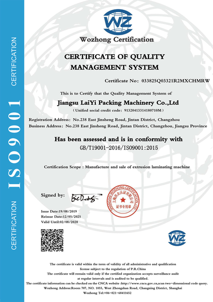 • 中国 JIANGSU LAIYI PACKING MACHINERY CO.,LTD. 認証